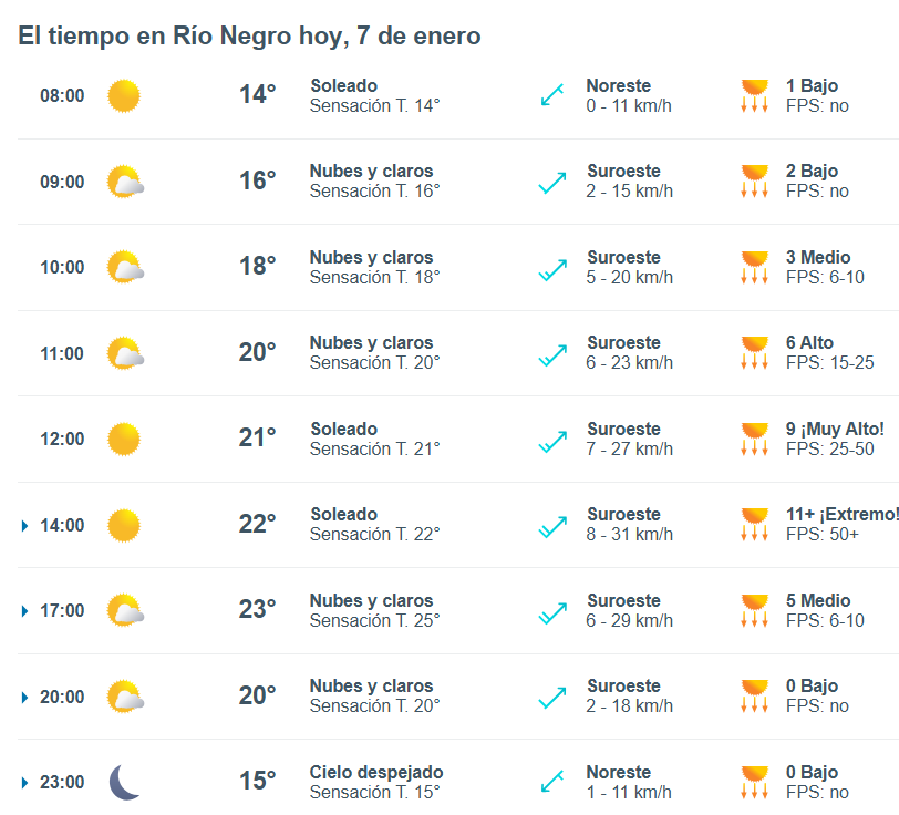 El pronóstico del tiempo para la ciudad de Río Negro, indica que hoy 7 de enero el cielo estará despejado por la mañana y la temperatura rondará entre 15 grados.