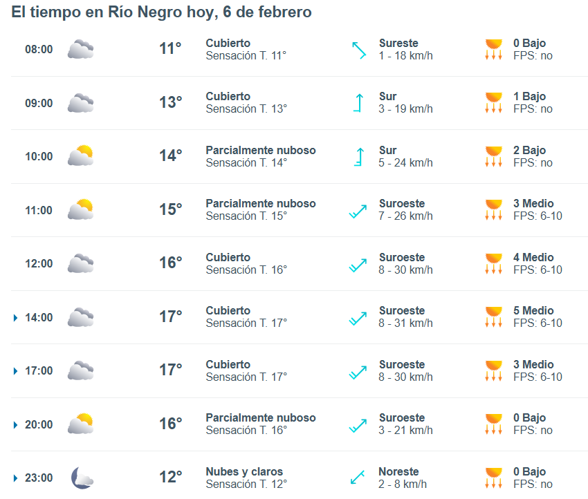 El pronóstico del tiempo para la ciudad de Río Negro, indica que hoy 6 de febrero el cielo estará parcialmente nublado por la mañana y la temperatura rondará entre 11 grados.