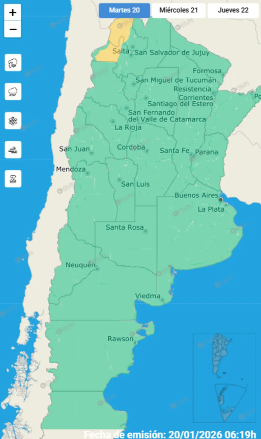 El martes 20 de enero de 2026 comienza con un panorama meteorológico dispar en el país: mientras gran parte del territorio disfruta de estabilidad, algunas provincias del norte argentino enfrentarán fuertes fenómenos climáticos que obligan a extremar precauciones.