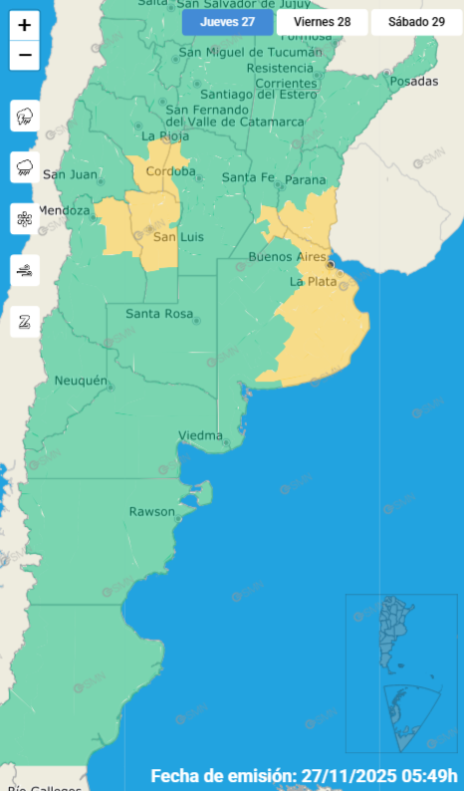 La advertencia incluye zonas del norte de Mendoza y San Luis, Córdoba, el sur de La Rioja, Entre Ríos, Santa Fe y la provincia de Buenos Aires.