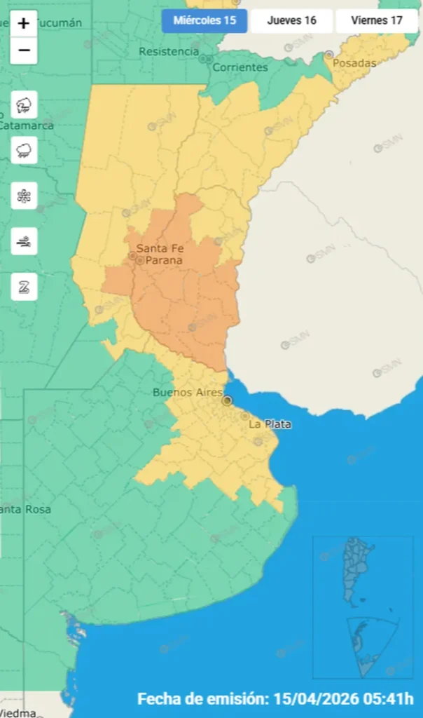 Las provincias alcanzadas por este nivel de alerta son Entre Ríos, el oeste de Corrientes, Santa Fe, el sudeste de Chaco y sectores de Formosa, donde se esperan fenómenos de fuerte intensidad y carácter persistente.
