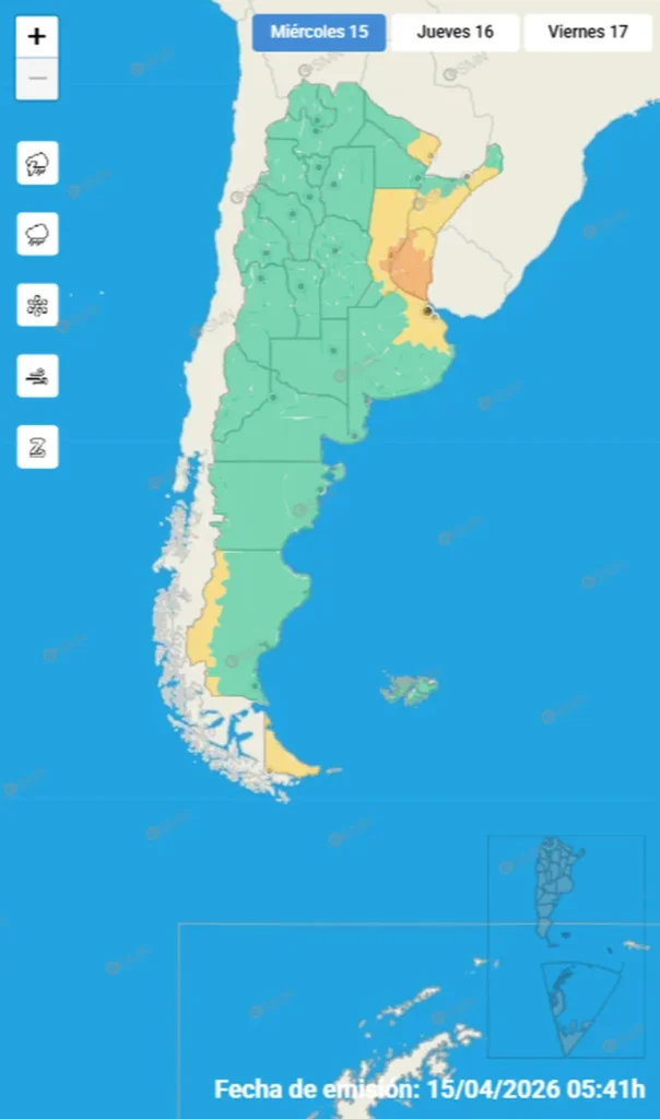 En paralelo, rige una alerta amarilla por lluvias en una amplia zona del país que incluye el centro y norte de la provincia de Buenos Aires, Santa Fe, Santiago del Estero, Corrientes, Misiones y Chaco, con acumulados estimados entre 30 y 80 milímetros.