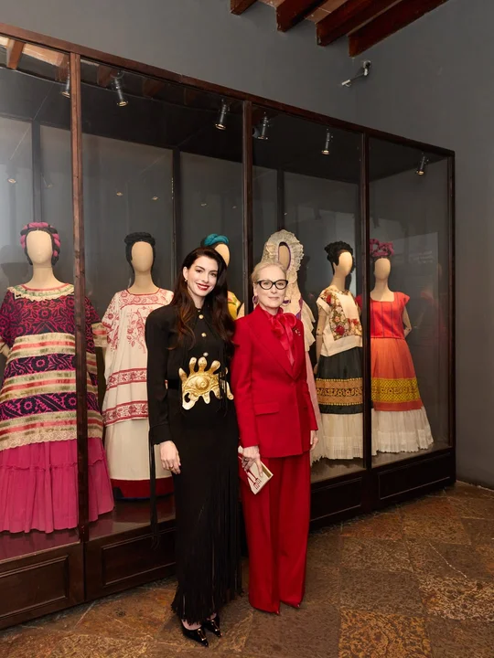Durante la jornada, ambas figuras lucieron vestuarios destacados: Streep optó por un conjunto monocromático rojo con un accesorio floral en referencia a la artista mexicana, mientras que Hathaway vistió un conjunto negro con detalles dorados.