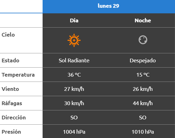 El parte del servicio meteorológico prevé que para después del mediodía el cielo estará algo nublado y los vientos del sector oeste tendrán velocidades estimadas de entre 23 y 31 km/h. La temperatura pronosticada sería de 35 grados.