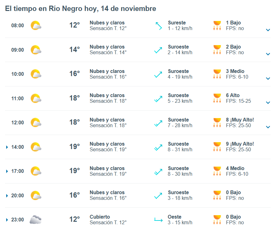 El pronóstico del tiempo para la ciudad de Río Negro, indica que hoy 14 de noviembre el cielo estará algo nublado por la mañana y la temperatura rondará entre 18 grados.