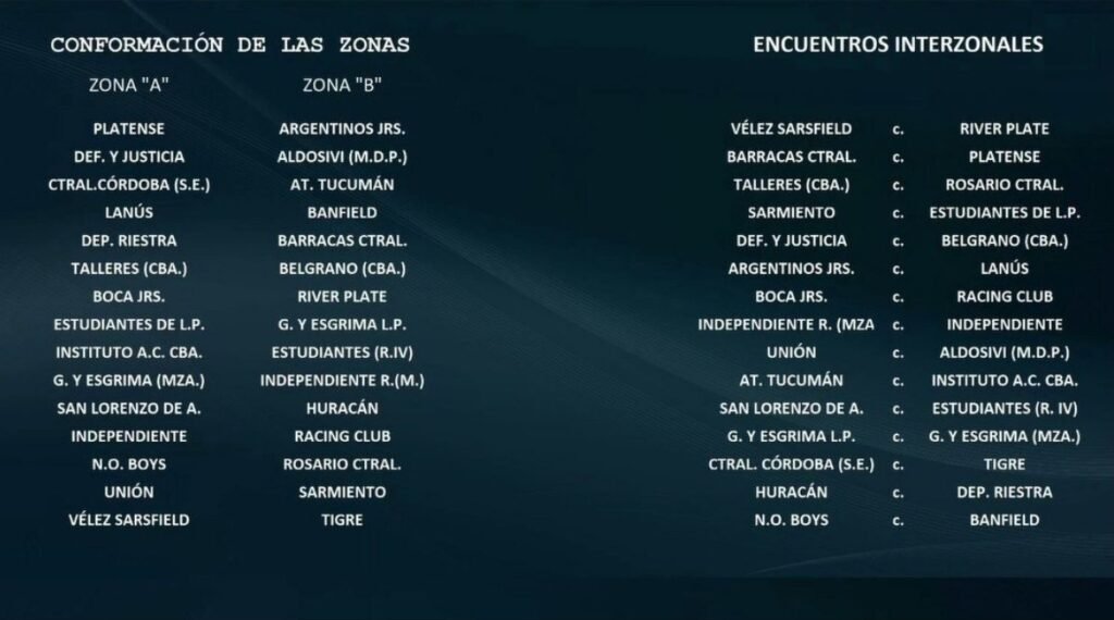 Las zonas fueron definidas por sorteo, lo que dejó abierta la posibilidad de que el azar armara grupos similares —o completamente distintos— a los de la temporada pasada. El procedimiento se realizó por parejas de equipos, no de manera individual: si una dupla quedaba compuesta por “Equipo 1” y “Equipo 2”, y el sorteo ubicaba al primero en la Zona A, automáticamente el segundo pasaba a la Zona B. Entre los criterios, la AFA priorizó la división de equipos clásicos, como Boca – River.
