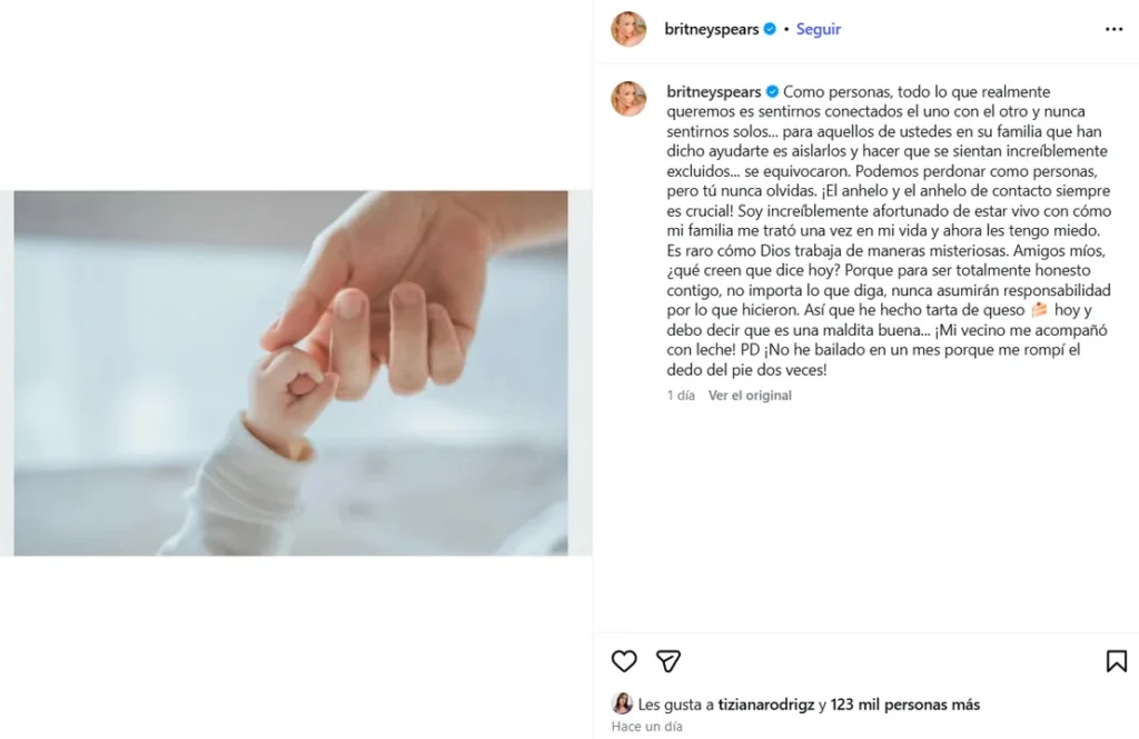 Britney Spears volvió a generar repercusión en redes sociales tras publicar un mensaje en su cuenta de Instagram en el que reflexiona sobre su relación con su familia, el aislamiento que atravesó durante años y el impacto emocional que, según sus palabras, aún persiste en su vida.