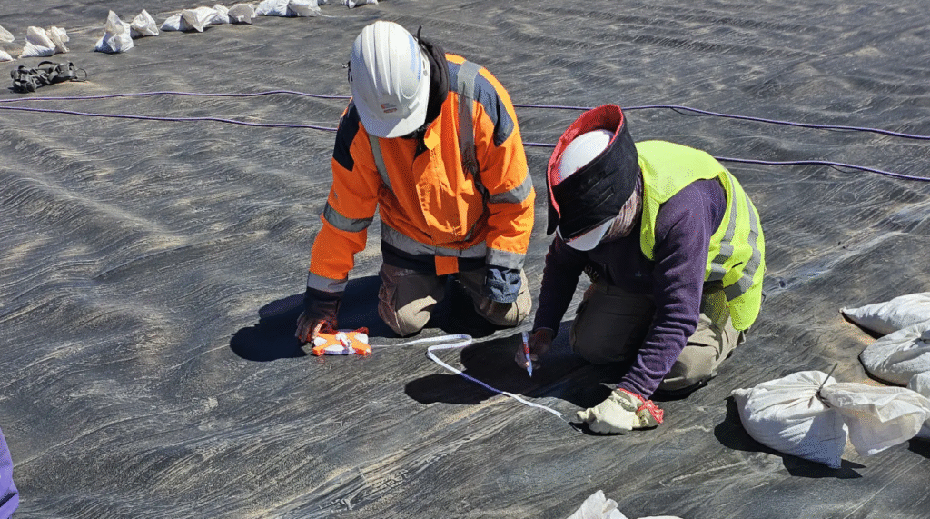 Recientemente, el proyecto alcanzó un hito clave: se completó la colocación de la geomembrana, elemento central del sistema de impermeabilización de los sectores operativos, que será fundamental cuando el proyecto entre en la etapa productiva.