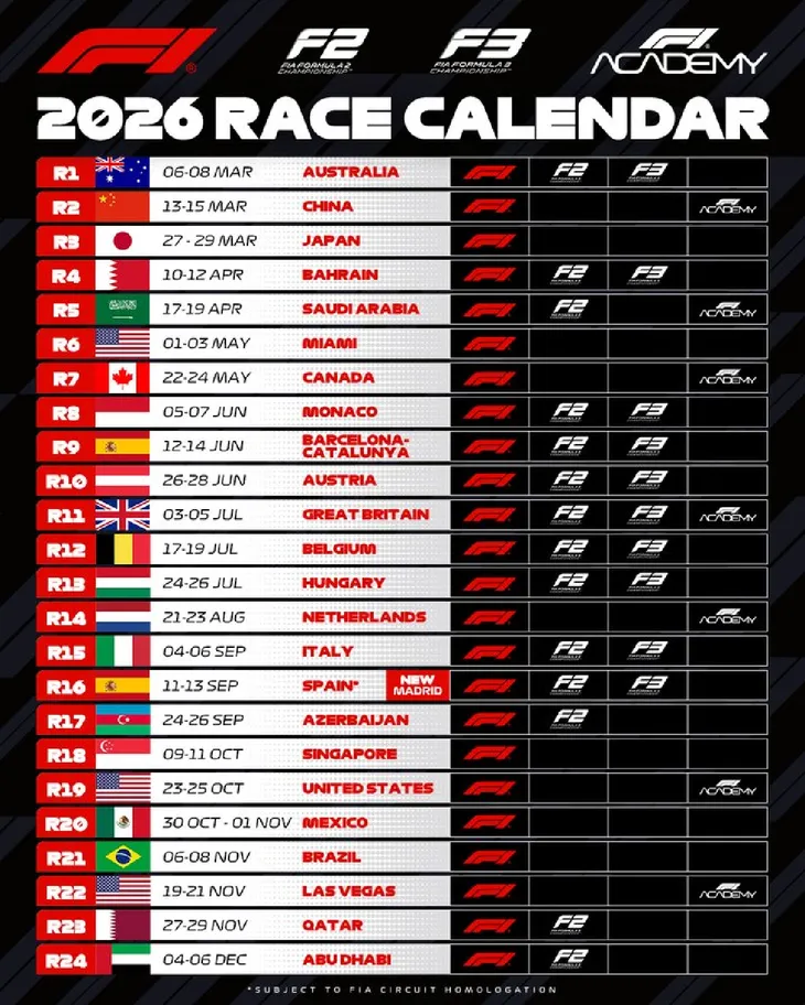 La FIA dio a conocer el calendario completo de Fórmula 1 2026, que contará con 24 Grandes Premios, y también confirmó la participación de pilotos argentinos en otras categorías de su organización.