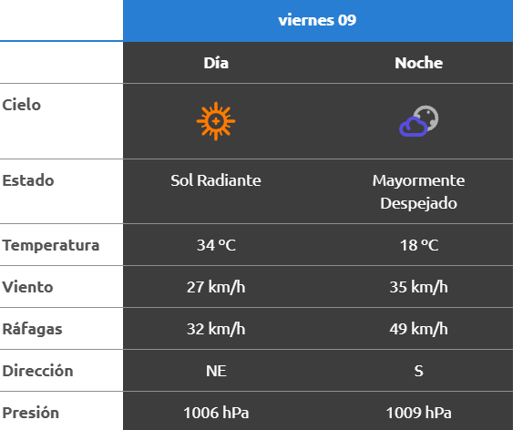A la noche, el clima rondará los 25 grados, mientras que los vientos serán del este a una velocidad de 32 y 41 kilómetros por hora. No se esperan lluvias para esta franja del día.