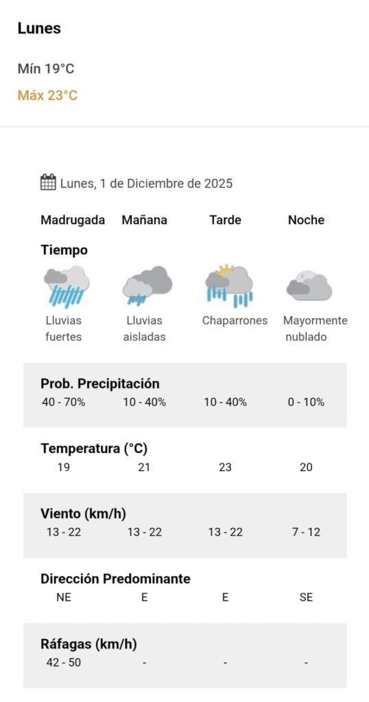 El parte del servicio meteorológico prevé que para después del mediodía el cielo estará con chaparrones y los vientos del sector este tendrán velocidades estimadas de entre 13 y 22 km/h. La temperatura pronosticada sería de 23 grados.