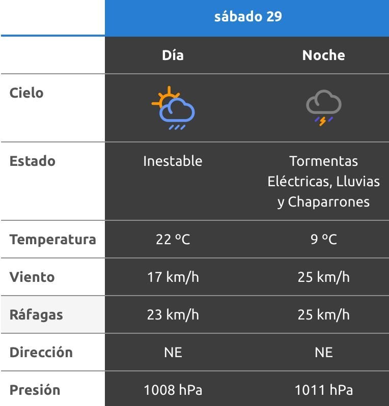 El parte del servicio meteorológico prevé que para después del mediodía el cielo estará con tormentas fuertes y los vientos del sector sudeste tendrán velocidades estimadas entre 13 y 22 km/h. La temperatura pronosticada sería de 25 grados.