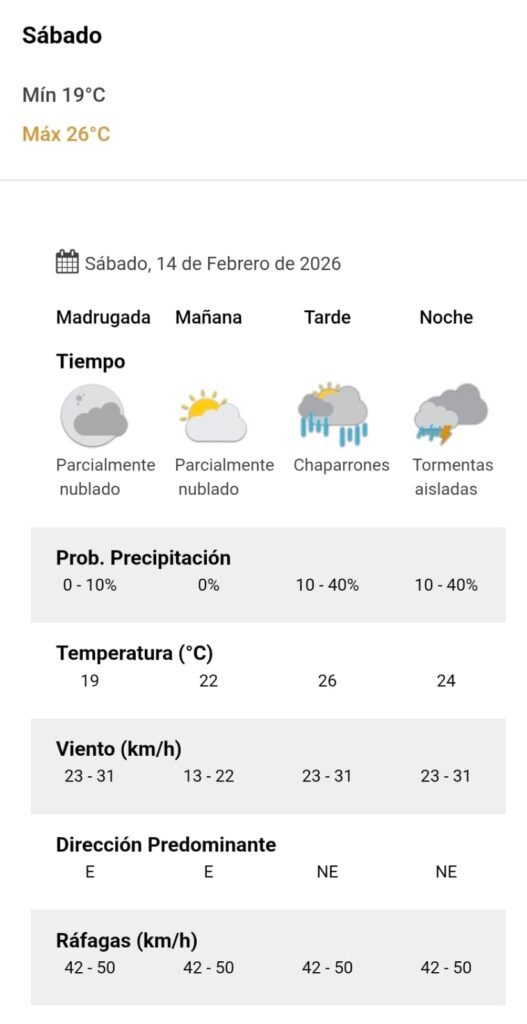 El parte del servicio meteorológico prevé que para después del mediodía el cielo estará con chaparrones y los vientos del sector noreste tendrán velocidades estimadas de entre 23 y 31 km/h. La temperatura pronosticada sería de 26 grados.
