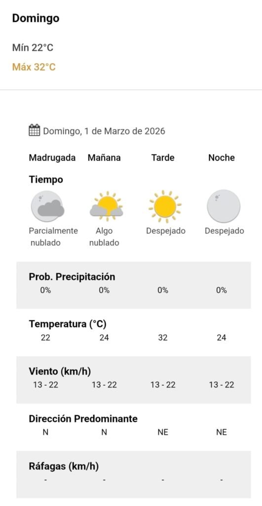 El parte del servicio meteorológico prevé que para después del mediodía el cielo estará despejado y los vientos del sector noreste tendrán velocidades estimadas de entre 13 y 22 km/h. La temperatura pronosticada sería de 32 grados.
