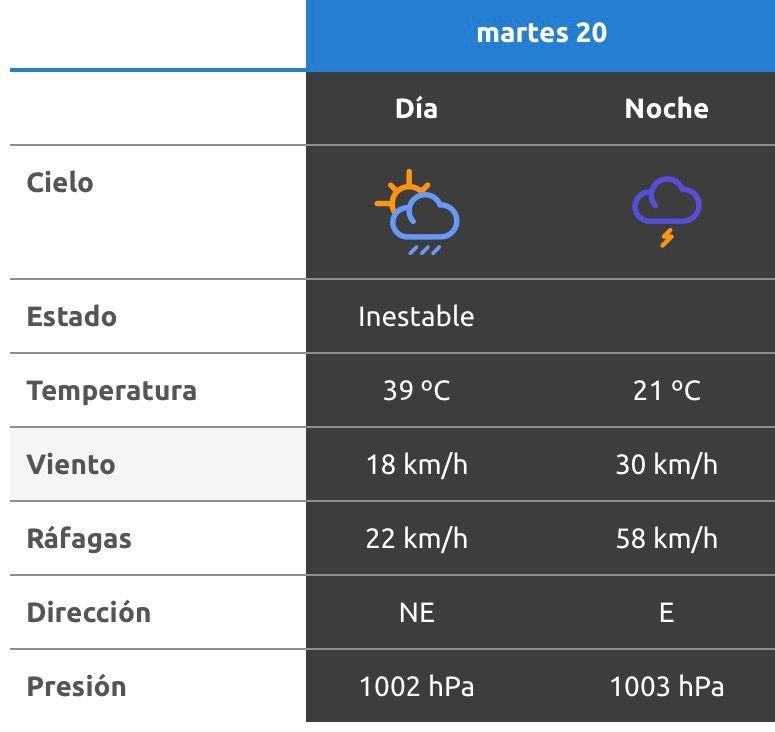 El parte del servicio meteorológico prevé que para después del mediodía el cielo estará algo nublado y los vientos del sector norte tendrán velocidades estimadas de entre 13 y 22 km/h. La temperatura pronosticada sería de 36 grados.