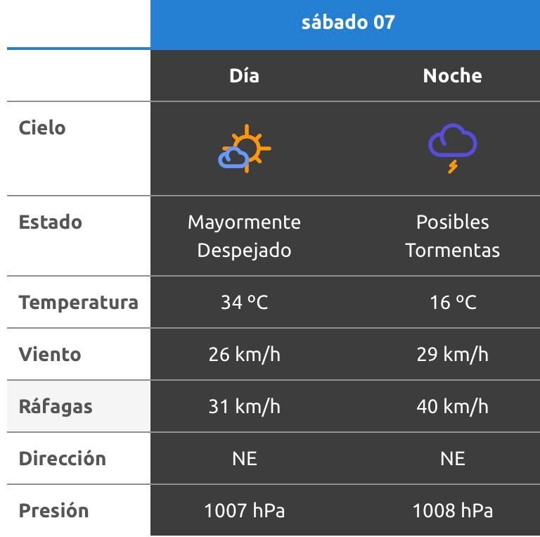 El parte del servicio meteorológico prevé que para después del mediodía el cielo estará ligeramente nublado y los vientos del sector norte tendrán velocidades estimadas de entre 23 y 31 km/h. La temperatura pronosticada sería de 31 grados.