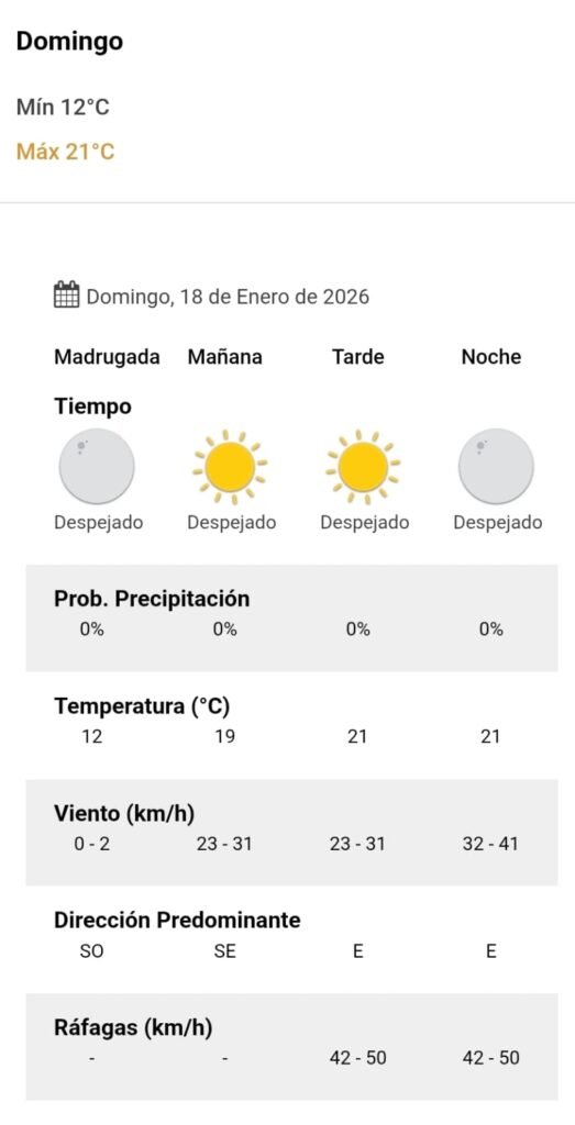 El parte del servicio meteorológico prevé que para después del mediodía el cielo estará despejado y los vientos del sector este tendrán velocidades estimadas de entre 23 y 31 km/h. La temperatura pronosticada sería de 21 grados.