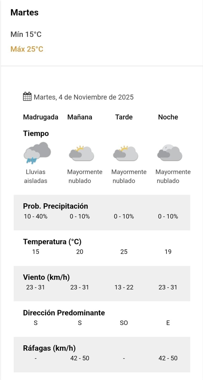 A la noche, el clima rondará los 19 grados, mientras que los vientos serán del este y correrán a una velocidad de entre 23 y 31 kilómetros por hora. La probabilidad de lluvia estaría en el orden del 10 por ciento para esta franja del día.