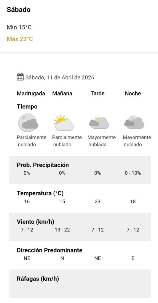 El parte del servicio meteorológico prevé que para después del mediodía el cielo estará mayormente nublado y los vientos del sector noreste tendrán velocidades estimadas de entre 7 y 12 km/h. La temperatura pronosticada sería de 23 grados.