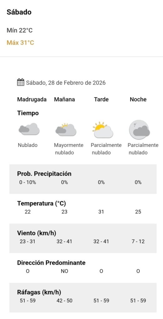 El parte del servicio meteorológico prevé que para después del mediodía el cielo estará parcialmente nublado y los vientos del sector oeste tendrán velocidades estimadas de entre 32 y 41 km/h. La temperatura pronosticada sería de 31 grados.