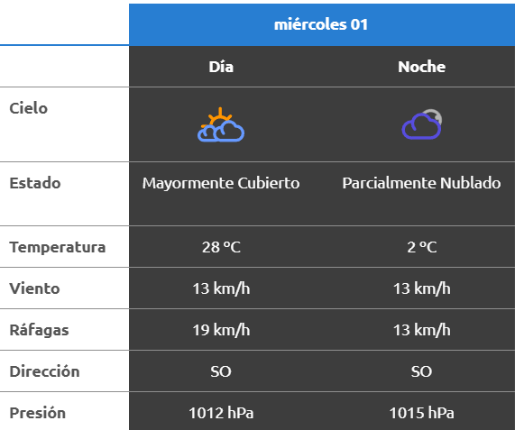 - Madrugada: despejada, 5°, ráfagas de hasta 50 km/h.