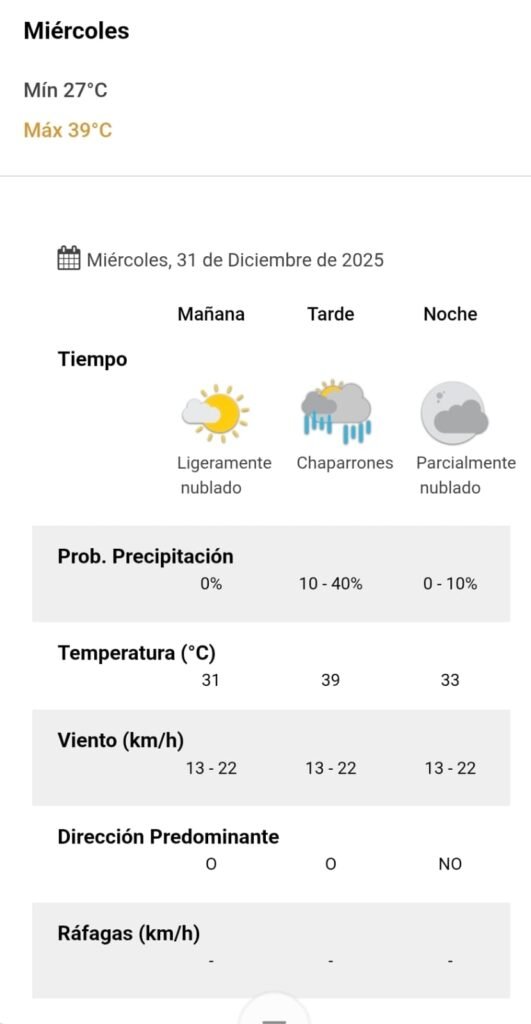 El Servicio Meteorológico Nacional anticipa que este 31 de diciembre, la temperatura rondará entre los 27 y 39 grados.