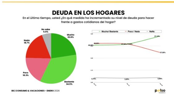 El informe también pone el foco en el aumento del endeudamiento como mecanismo para sostener la economía doméstica. Según Pulso Research, el 57,1% de las familias se endeudó en el último tiempo para poder afrontar los gastos del hogar.