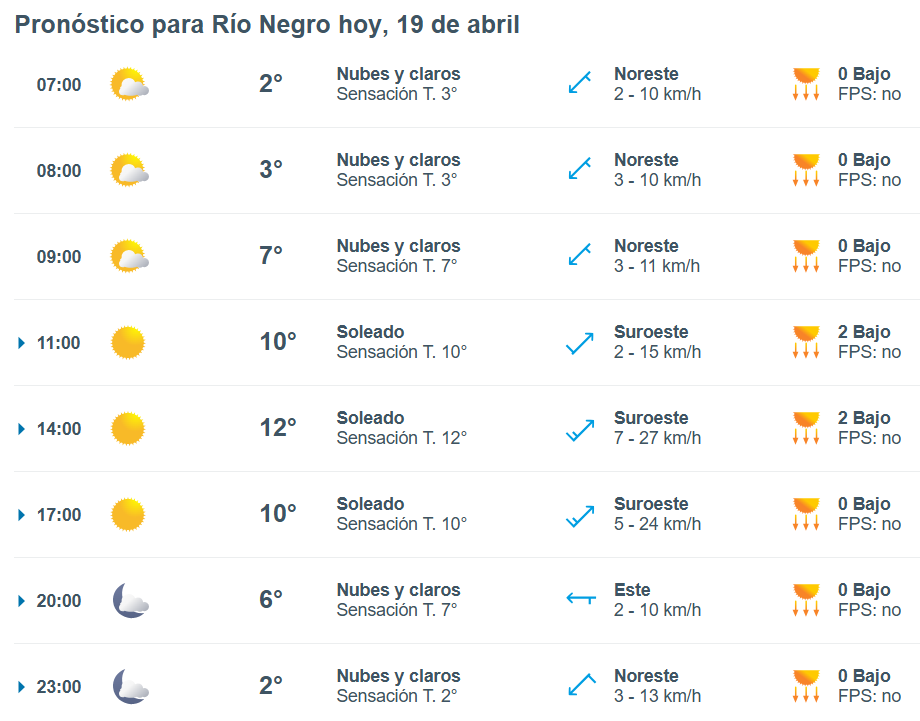 El pronóstico del tiempo para la ciudad de Río Negro, indica que hoy 19 de abril el cielo estará mayormente nublado por la mañana y la temperatura rondará entre 2 grados.