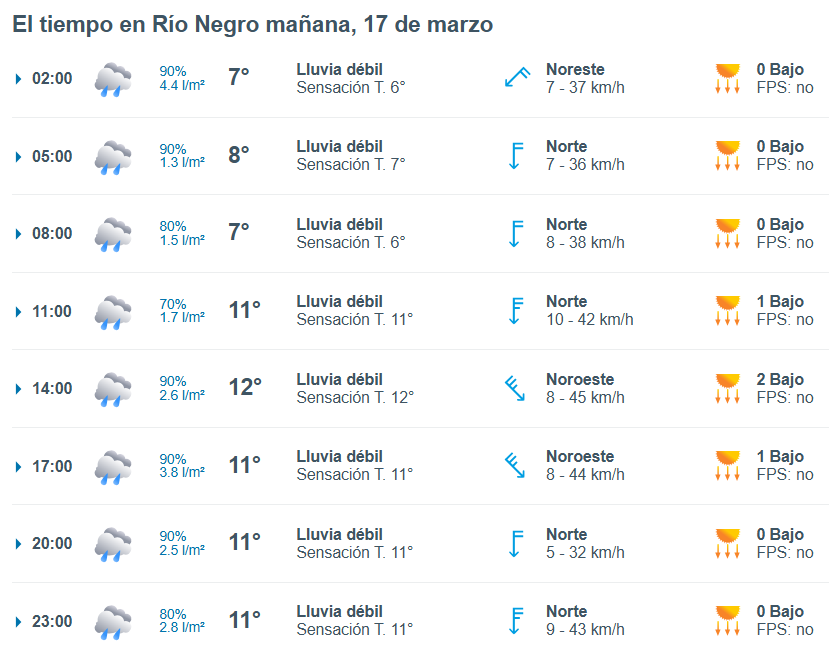 El pronóstico del tiempo para la ciudad de Río Negro, indica que hoy 17 de febrero el cielo estará con lluvias por la mañana y la temperatura rondará entre 11 grados.