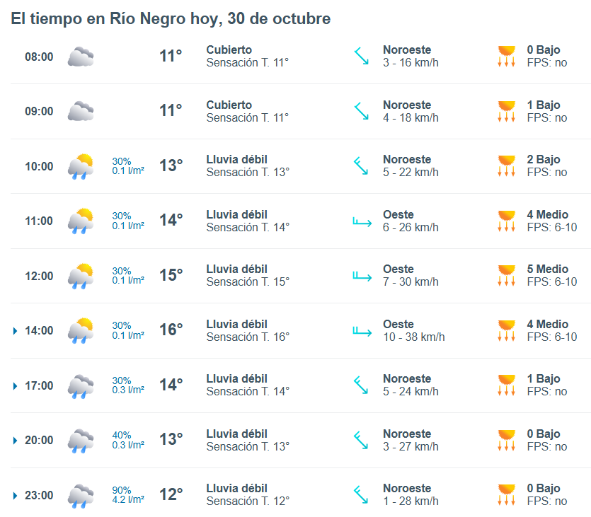 El pronóstico del tiempo para la ciudad de Río Negro, indica que hoy 30 de octubre el cielo estará algo nublado por la mañana y la temperatura rondará entre 16 grados.