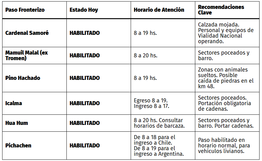 Para cruzar a Chile desde Neuquén o Río Negro hoy , la información oficial es clave. A continuación, te brindamos el reporte actualizado de habilitación de rutas, los horarios de aduana y las precauciones viales que debés tomar.