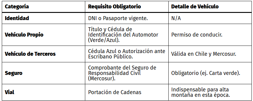 Antes de emprender el cruce hacia Chile desde cualquier punto de Argentina, recordá verificar la siguiente documentación obligatoria: