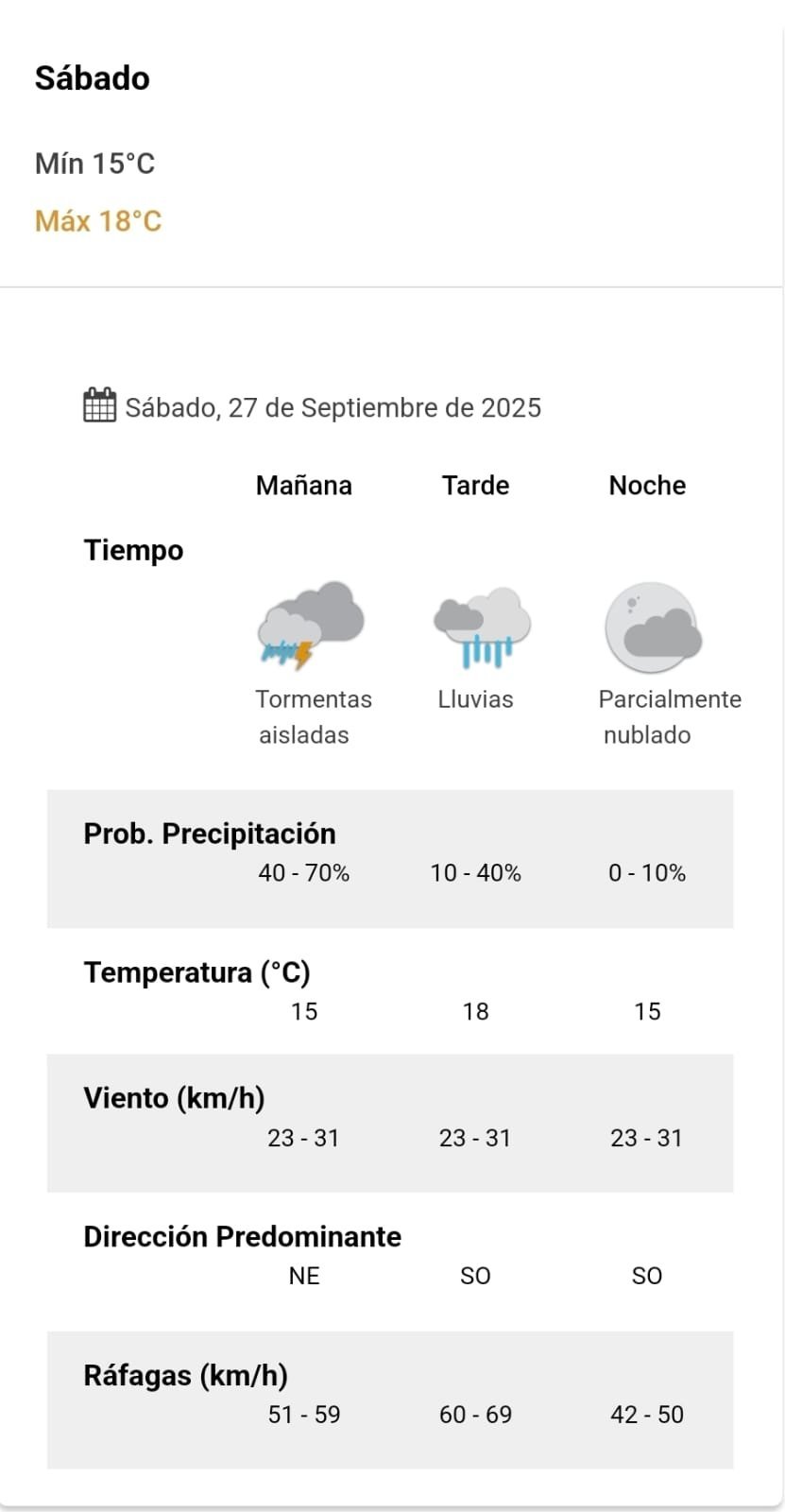 Durante la tarde el cielo estará con lluvias aisladas y los vientos del sector sudoeste tendrán velocidades estimadas de entre 23 y 31 km/h. La temperatura pronosticada sería de 8 grados. A la noche, el clima rondará los 4 grados, mientras que los vientos serán del oeste y correrán a una velocidad de entre 32 y 41 kilómetros por hora. La probabilidad de lluvia estaría en el orden del entre 70 y 100 por ciento para esta franja del día.