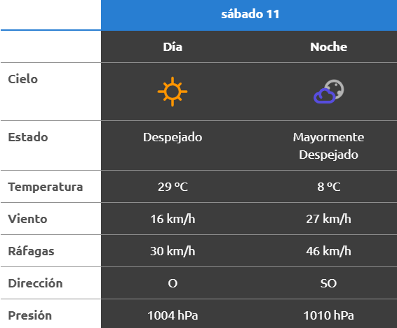 A la noche, el clima rondará los 21 grados, mientras que los vientos serán del oeste y soplarán a una velocidad de entre 23 y 31 kilómetros por hora. La probabilidad de lluvia estaría en el orden del por ciento para esta franja del día.
