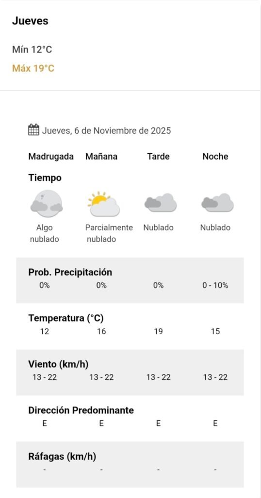 El parte del servicio meteorológico prevé que para después del mediodía el cielo estará nublado y los vientos del sector este tendrán velocidades estimadas de entre 13 y 22 km/h. La temperatura pronosticada sería de 19 grados.