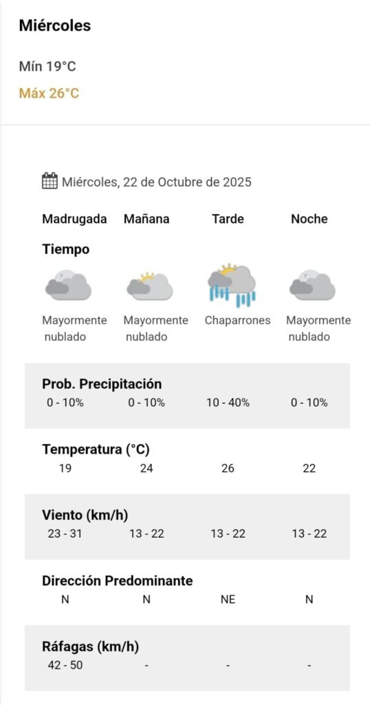 El parte del servicio meteorológico prevé que para después del mediodía el cielo estará con chaparrones y los vientos del sector noreste tendrán velocidades estimadas de entre 7 y 12 km/h. La temperatura pronosticada sería de 27 grados.