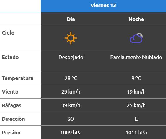 El parte del servicio meteorológico prevé que para después del mediodía el cielo estará parcialmente nublado y los vientos del sector sudeste tendrán velocidades estimadas de entre 23 y 31 km/h. La temperatura pronosticada sería de 24 grados.