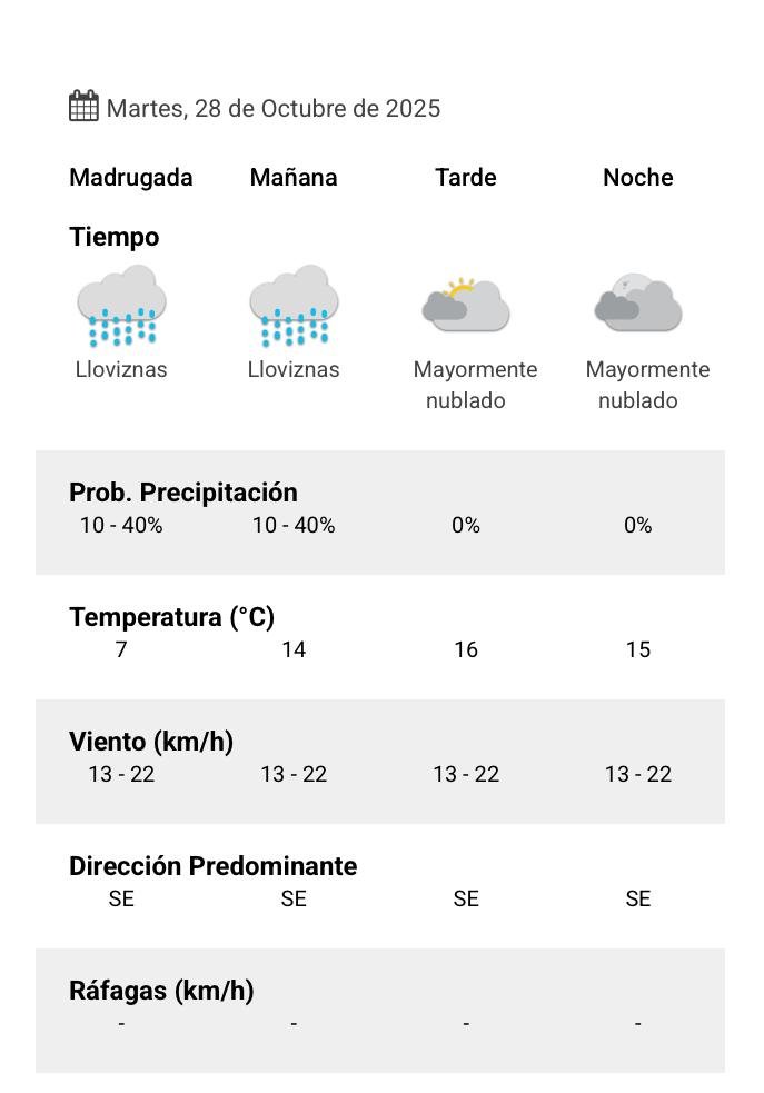 El parte del servicio meteorológico prevé que para después del mediodía el cielo estará mayormente nublado y los vientos del sector sudeste tendrán velocidades estimadas entre 13 y 22 km/h. La temperatura pronosticada sería de 16 grados.