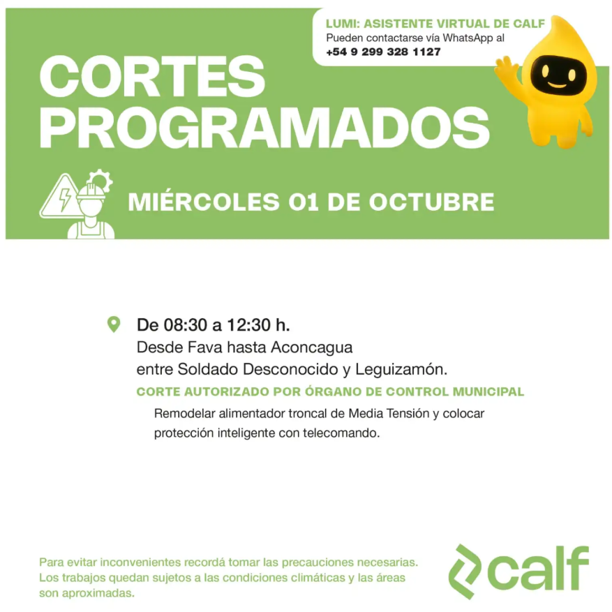 La Cooperativa de Agua, Luz y Fuerza de Neuquén (CALF) anunció un nuevo corte de energía eléctrica que impactará a un sector de la ciudad este miércoles 1 de octubre. La interrupción tendrá una duración estimada de hasta cuatro horas, por lo que se recomienda a los vecinos tomar precauciones y planificar sus actividades.