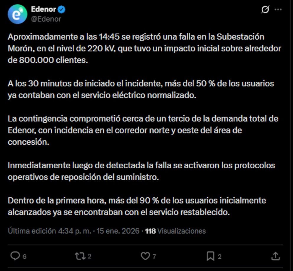 En un comunicado que se difundió en redes sociales, Edenor explicó: “Aproximadamente a las 14:45 se registró una falla en la Subestación Morón, en el nivel de 220 kV, que tuvo un impacto inicial sobre alrededor de 800.000 clientes. A los 30 minutos de iniciado el incidente, más del 50 % de los usuarios ya contaban con el servicio eléctrico normalizado”.