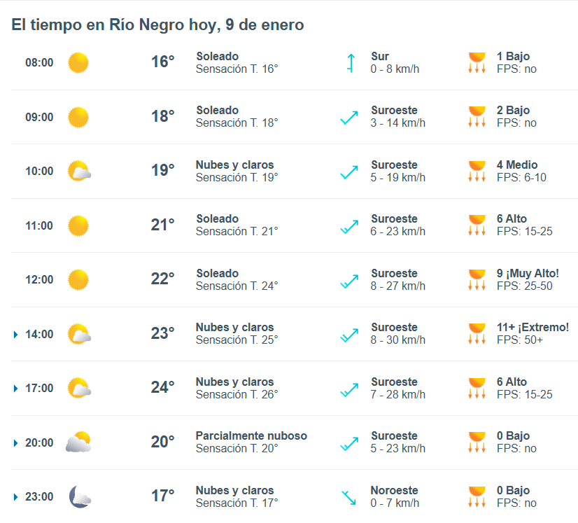 El pronóstico del tiempo para la ciudad de Río Negro, indica que hoy 9 de enero el cielo estará parcialmente nublado por la mañana y la temperatura rondará entre 16 grados.