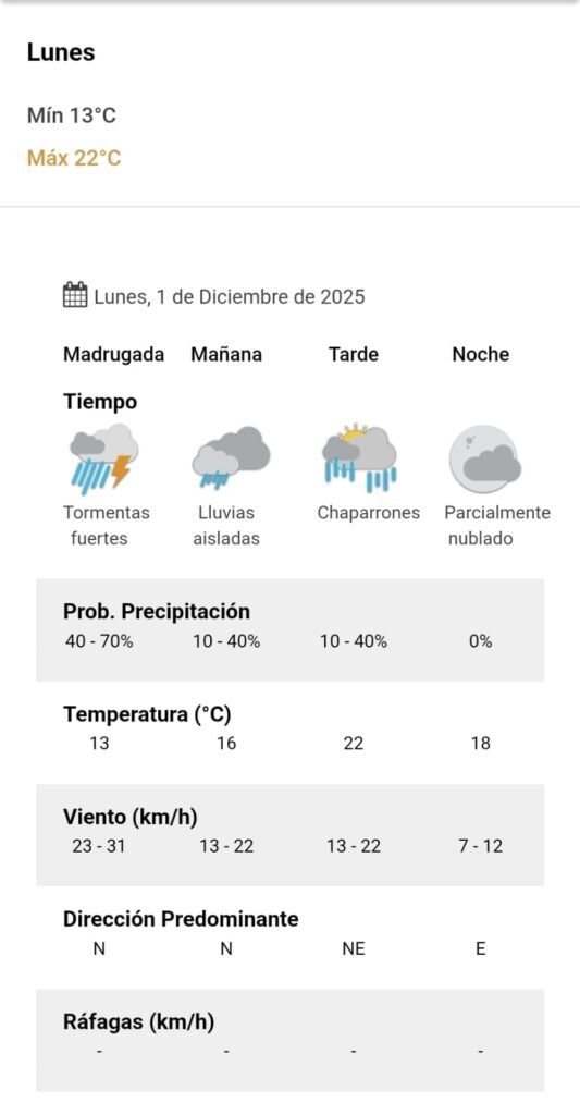El parte del servicio meteorológico prevé que para después del mediodía el cielo estará con chaparrones y los vientos del sector noreste tendrán velocidades estimadas de entre 13 y 22 km/h. La temperatura pronosticada sería de 22 grados.