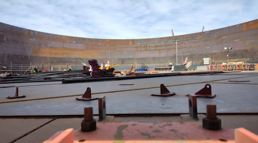 En la cabecera del sistema, continúan las tareas sobre los tanques de almacenamiento TK-7 y TK-8, que registran avances del 77% y 55% respectivamente en la instalación de virolas. A la par, se ejecutan trabajos en cañerías colectoras, sistemas contra incendios y obras civiles destinadas a equipos y edificios auxiliares.