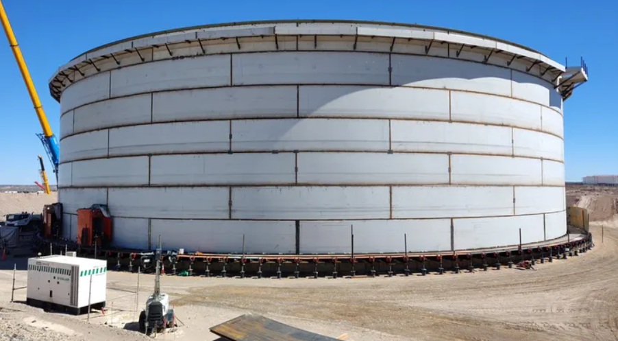 En la futura terminal de exportación ubicada sobre la costa rionegrina ya se construyeron las bases de los seis tanques previstos, con protección catódica instalada en casi la totalidad de ellos. Actualmente, hay tres tanques en proceso de montaje (TK404, TK401 y TK406), además de las bases del sistema contra incendios y de las trampas de scraper que integrarán el circuito operativo.