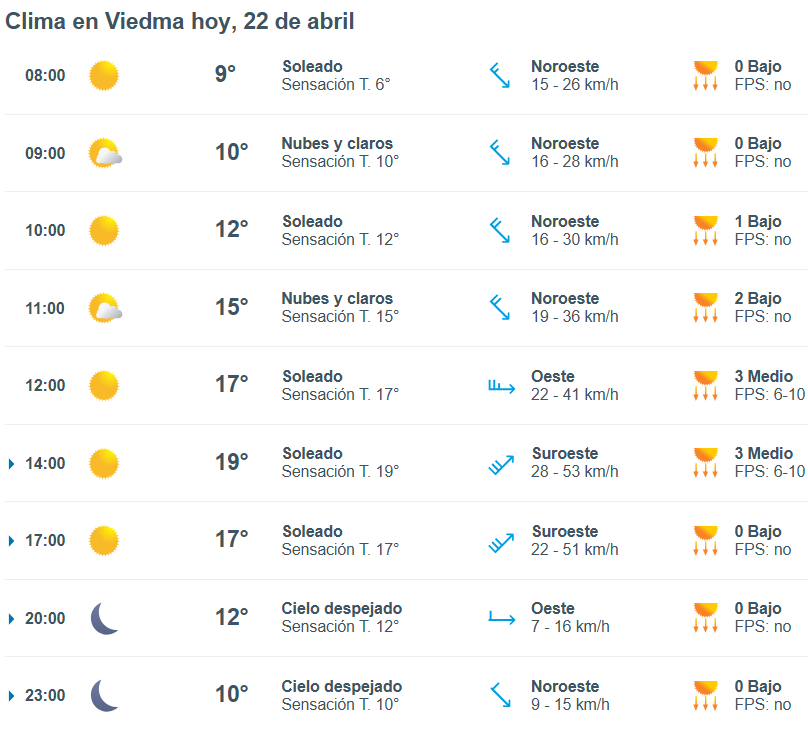 De acuerdo al parte del Servicio Meteorológico Nacional, el clima en esta ciudad de Río Negro presenta una probabilidad de lluvia de entre 10 y 40 por ciento, y los vientos del sudoeste correrán a una velocidad de entre 23 y 31 kilómetros por hora. La humedad sería del 74 por ciento, y la visibilidad sería regular.