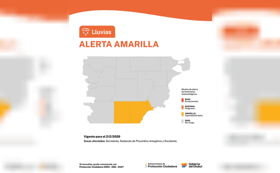 En paralelo, el SMN emitió una alerta naranja por temperaturas extremas para amplias zonas del oeste y sudoeste de la provincia, que abarca Cushamen, Futaleufú, Languiñeo, Tehuelches y Río Senguer. Estas condiciones pueden tener un efecto moderado a alto en la salud, especialmente en niños, personas mayores y quienes padecen enfermedades crónicas.