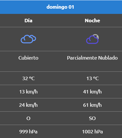 De acuerdo al parte del Servicio Meteorológico Nacional, el clima presenta una probabilidad de lluvia del 10 por ciento, y los vientos del oeste correrán a una velocidad de entre 23 y 31 kilómetros por hora. La humedad sería del 28 por ciento, y la visibilidad sería buena.