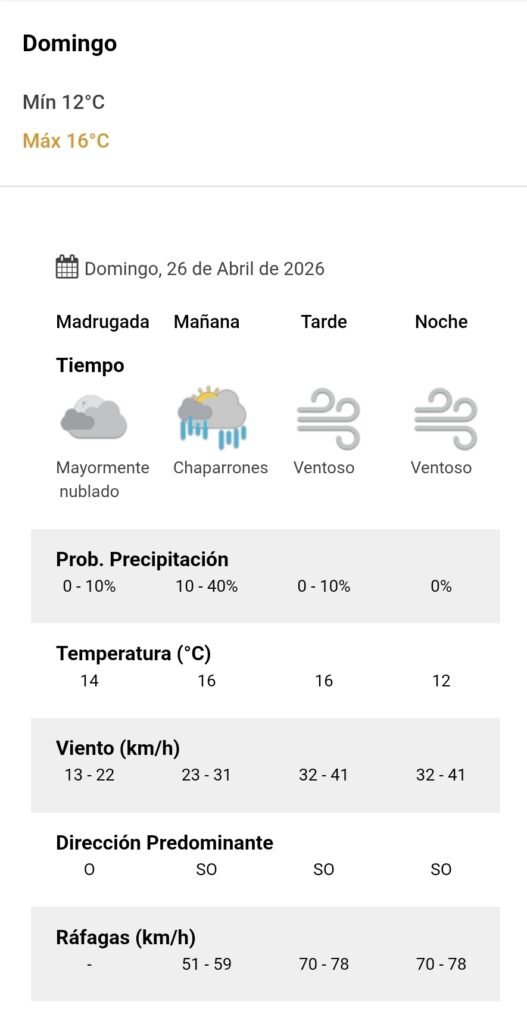 El parte del servicio meteorológico prevé que para después del mediodía el cielo estará ventoso y los vientos del sector sudoeste tendrán velocidades estimadas de entre 32 y 41 km/h. La temperatura pronosticada sería de 16 grados.