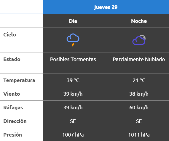 El parte del servicio meteorológico prevé que para después del mediodía el cielo estará parcialmente nublado y los vientos del sector este tendrán velocidades estimadas de entre 13 y 22 km/h. La temperatura pronosticada sería de 37 grados.