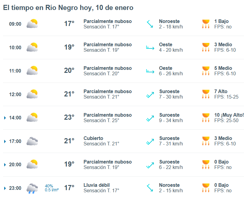 El pronóstico del tiempo para la ciudad de Río Negro, indica que hoy 10 de enero el cielo estará algo nublado por la mañana y la temperatura rondará entre 17 grados.